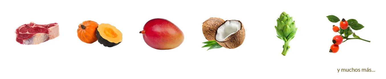 Corazon de buey (27 %), pulmon de buey (23 %), calabaza (19 %), pepino, hinojo, chirivias*, mango (4 %), harina de coco, harina de semilla de calabaza, semilla de psyllium, aceite de granilla, aceite de linaza, levadura de cerveza*, concha de ostra*, hoja de alcachofa* (0,3 %), escaramujo*, remolacha*, diente de leon*, albahaca*, arcilla mineral*, alga marina*, minerales *seco
