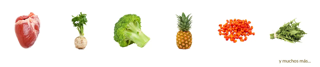 Corazon de pavo (42 %), zanahoria, apio (11 %), brocoli, chirivia*, higado de pavo (8 %), pina (4 %), harina de coco, harina de semilla de calabaza, semilla de psyllium, aceite de granilla, levadura de cereveza*, concha de ostra*, albahaca*, baya de espino amarillo* (0,3 %), hoja de alcachofa*, diente de leon*, arcilla mineral*, alga marina*, minerales *seco.
