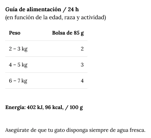 Ingredientes: ternera y pavo 71 % (carne de ternera, corazones de ternera, hígado de ternera, carne de pavo, corazones de pavo, hígado de pavo), caldo 27,7 %, minerales 1 %, aceite de lino 0,2 %, menta de gato 0,1 %