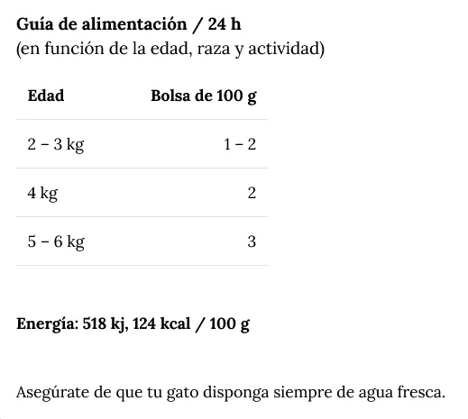 Aditivos/KG: aditivos nutricionales: vitamina D3 200 UI, taurina 1.500 mg, zinc (como sulfato de zinc, monohidratado) 25 mg, manganeso (como sulfato manganoso (II), monohidratado) 1,4 mg, yodo (como yodato de calcio, anhidro) 0,75 mg.