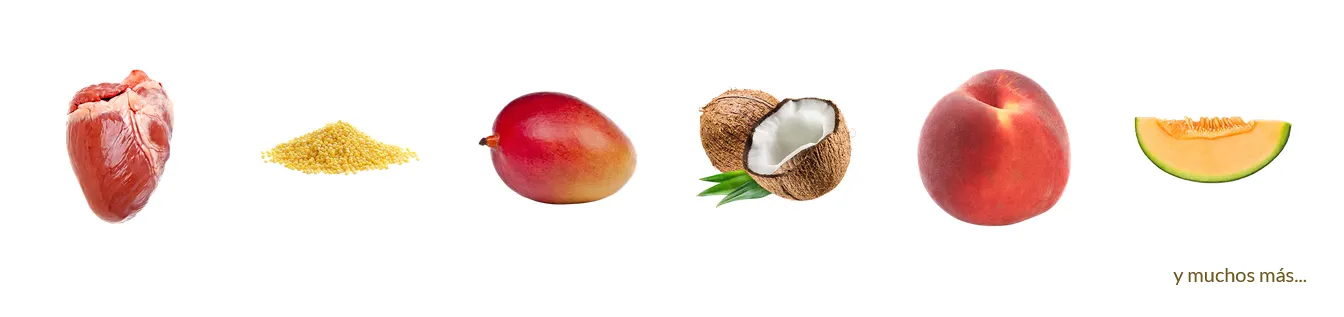 Corazón de buey (35 %), zanahoria, calabacín, pulmón de buey (11 %), hígado de buey (8 %), mijo (5 %), batata, manzana (5 %), mango (2 %), melocotón (2 %), kiwi (2 %), melón (2 %), harina de coco (1 %), aceite de linaza, levadura de cerveza*, cáscara de ostra*, semillas de girasol (0,3 %), lavanda*, mejorana*, tomillo*, melisa*, verdolaga*, cúrcuma* (0,1 %), espirulina*, arcilla mineral*, alga marina*, minerales *ingrediente seco