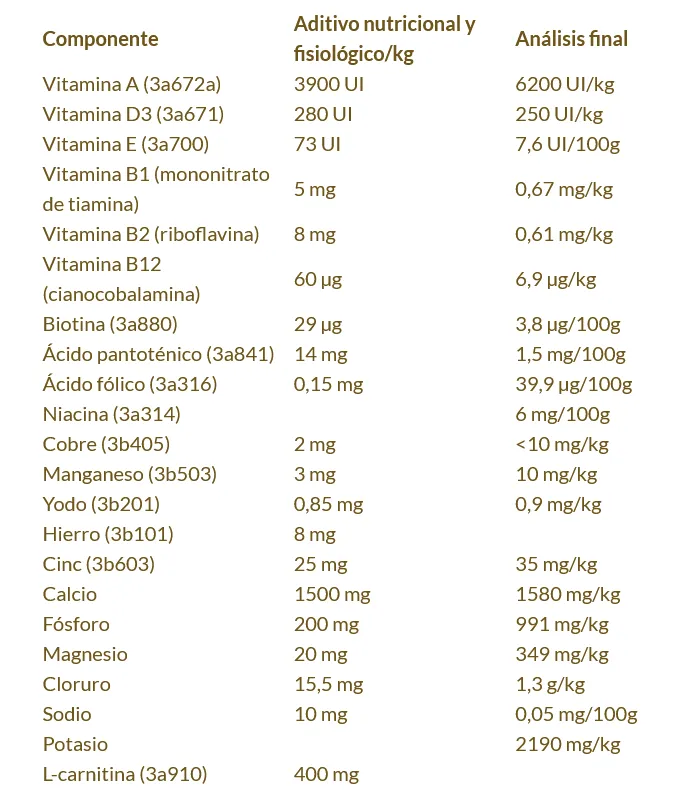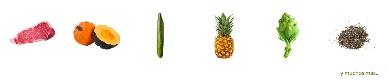 Carne muscular de venado (42 %), zanahoria, calabaza, pepino, chirivía*, hinojo (6 %), brócoli (4 %), piña, altramuz molido, celulosa*, harina de coco, hojas de alcachofa*, cáscaras de psyllium*, psyllium*, harina de semillas de chía, diente de león*, caléndula*, milenrama*, levadura de cerveza*, cáscara de ostra*, alga marina*, minerales *ingrediente seco