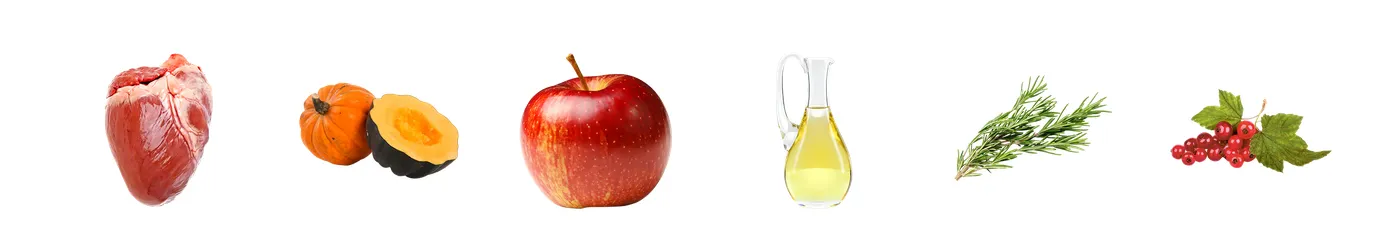 Corazones de pollo (27%), estómagos de pollo (27%), pechuga de pollo (13%), calabaza, patata, boniato (4%), tomate (4%), apio (2%), manzana (1%), arándanos (0, 6%), aceite de colza, levadura de cerveza*, concha de ostra*, coco rallado, albahaca* (0,1%), romero* (0,1%), sésamo*, arcilla mineral*, orégano*, sal andina, algas *, minerales *secos.