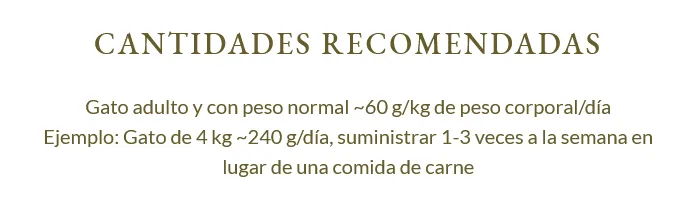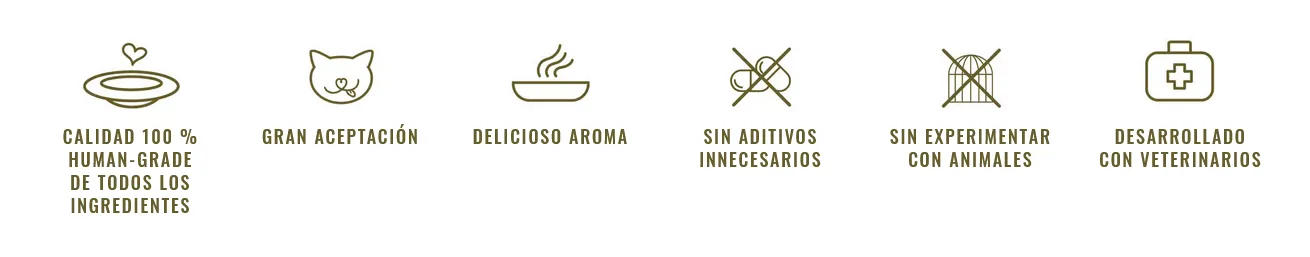 Los menús Terra Felis sin cereales presentan una proporción muy alta de carne y pescado, con un 91 % de carne muscular fresca y valiosas vísceras. Esto le ofrece al gato como carnívoro los ácidos grasos Omega-6 importantes para él y la abundante proteína animal que necesita para la obtención de energía y para todos los procesos del metabolismo. Para que el funcionamiento y la peristalsis del intestino sean saludables, el gato necesita una pequeña cantidad de fibras. Por ello, todos los menús de Terra Felis se complementan con una variante selecta de verdura y con hierba gatera. Las comidas se completan con la incorporación de taurina y aceite de colza rico en ácidos grasos Omega-3. Se emplean exclusivamente materias primas con calidad 100 % human-grade. Esta calidad y esta frescura se reflejan en el aroma extremadamente apetitoso y exquisito de los menús y generan una buena aceptación entre los gatos.