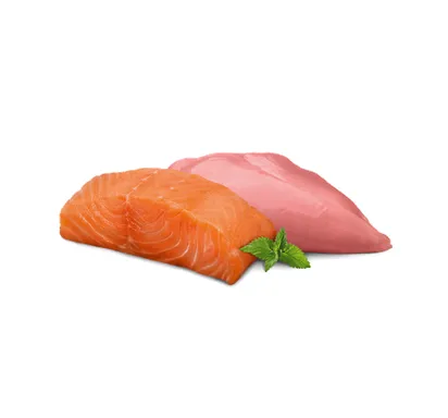 Filete de salmón (62 %), hígado de pollo (15 %), carne muscular de pollo (8 %), piel de pollo (6 %), calabaza cacahuete (4 %), tomate en polvo, aceite de colza, hierba gatera* *Ingrediente seco