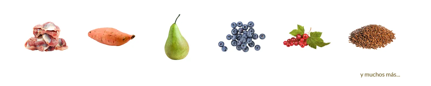 Filete de pollo (20 %), pollo (0 %), pollo de conejo (0 %), carne de pechuga, carne de si (7 %), hígado de pollo (6 %), músculo de pollo (6 %), dulce de patata (6 %) , pera (4%), pance lacilla, arándano (2%), castaña (2%), aceite de pescado, coco, semillas de lino, lyn-glucanos, levadura de cerveza, cúrcuma (0,1 %), L-carnitina, salvia (0,1%), romero (0,1%), tomillo, concha de ostra, arcilla, espirulina, sustancias minerales. secado