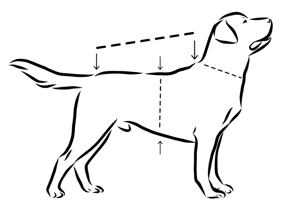 Medida de la espalda: Esta es la medida más importante. Coloca la cinta métrica en la base del cuello de tu perro, entre la cruz, y mide hasta la base de la cola. La longitud de la espalda se puede ajustar hasta 5 cm más corta.