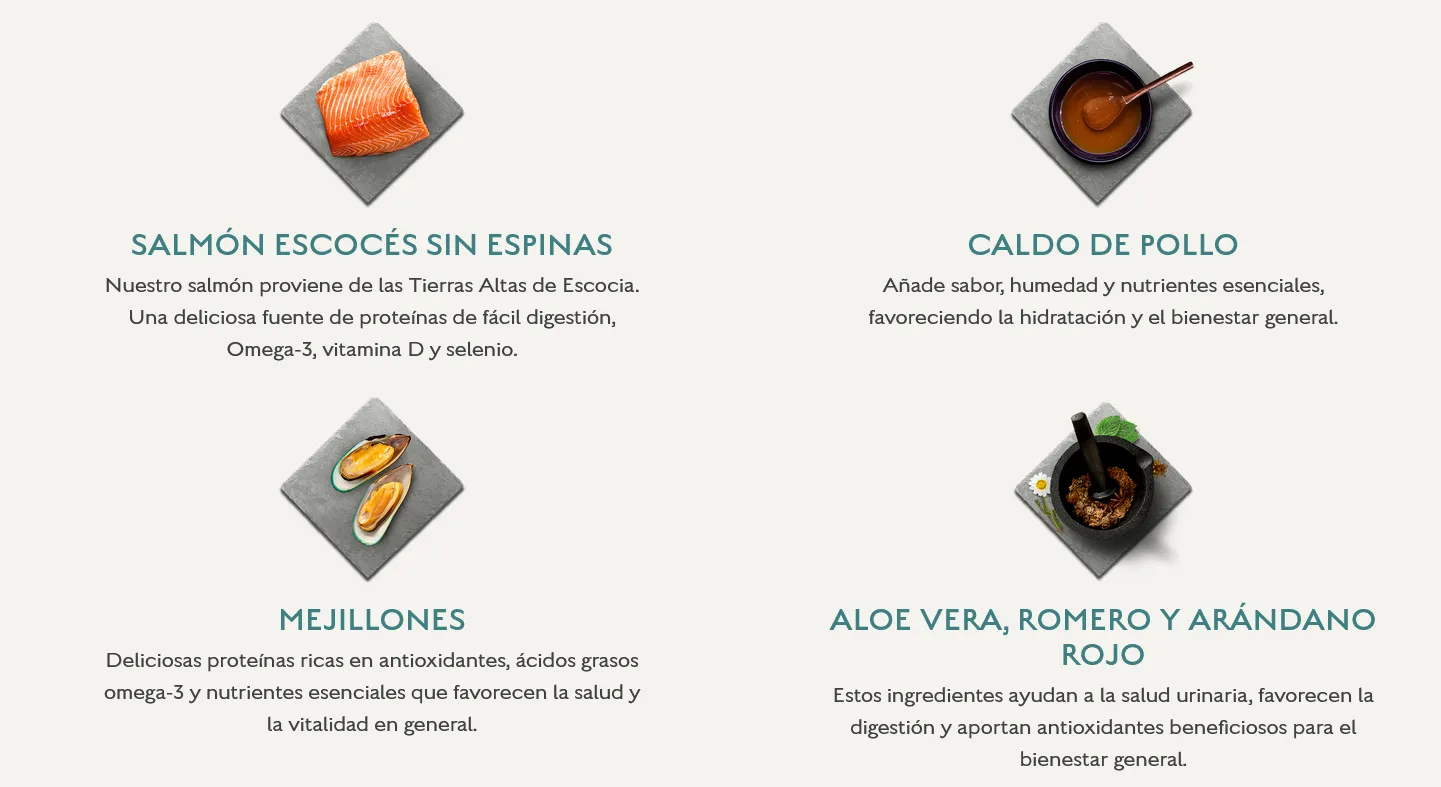 Pollo fresco 54%, salmón fresco 26%, caldo de pollo, arándanos rojos 1%, minerales, mejillón de labio verde, aceite de cártamo, aloe vera y romero.