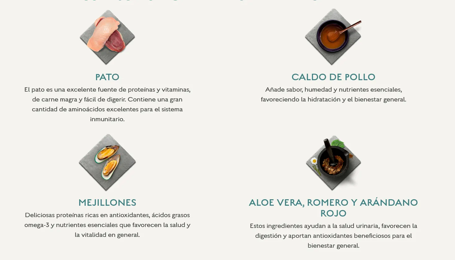 Pollo fresco 54%, pavo fresco 26%, caldo de pollo, arándanos rojos 1%, minerales, mejillón de labio verde, aceite de cártamo, aloe vera y romero.