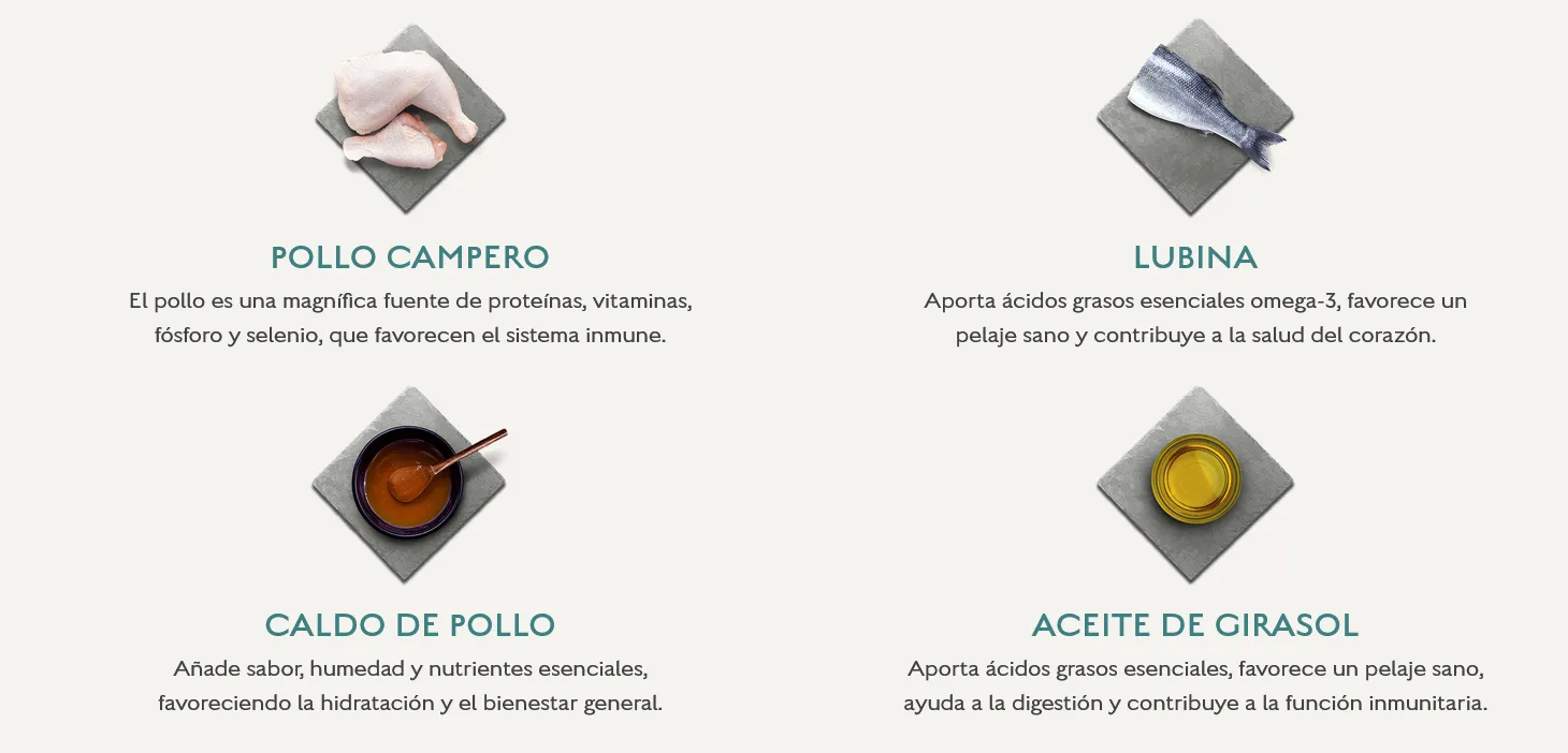 Pechuga de pollo (58%), caldo de pollo (31%), lubina (5%), aceite de girasol, agente espesante (tapioca) y minerales.