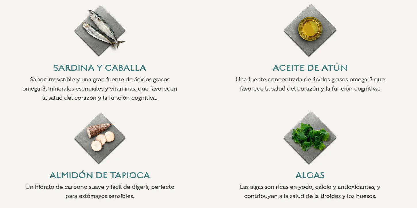Sopa de pescado océanico 89%, caballa 2,5%, sardina 2,5%, almidón de tapioca, minerales, algas y aceite de atún.