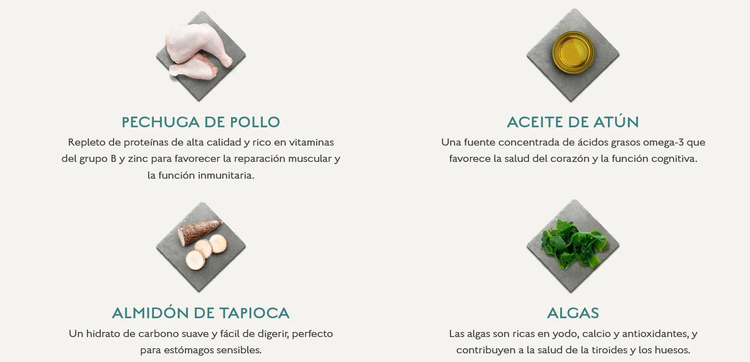 Sopa de pollo 89%, pechuga de pollo 5%, almidón de tapioca, minerales, algas y aceite de atún.