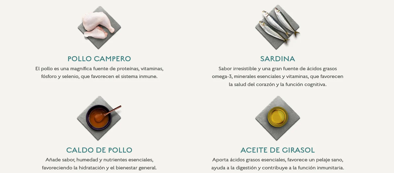 Pechuga de pollo (58%), caldo de pollo (31%), sardinas (5%), aceite de girasol, agente espesante (tapioca) y minerales.