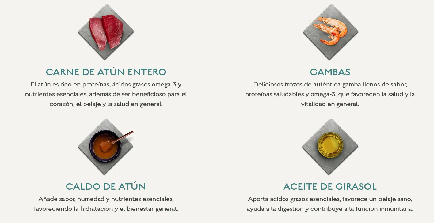 Carne de atún (58%), caldo de atún (32%), gambas (5%), agente espesante (tapioca), aceite de girasol y minerales.